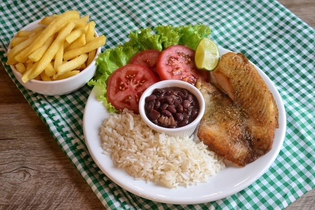 arroz, fritas, saladas, feijão, 200 gramas de filé de tilápia